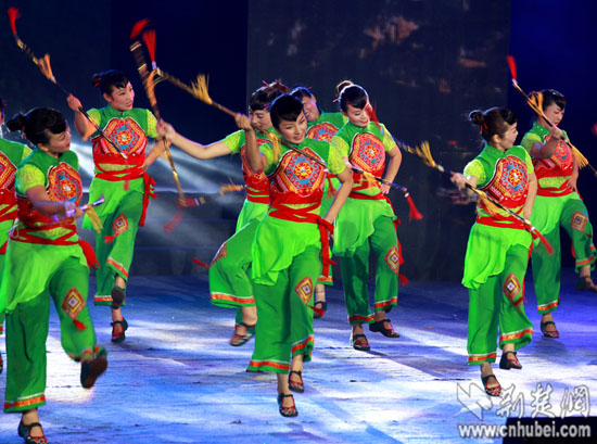 在第二届群众广场舞活动全省集中展演晚会上,潜江市园林镇群文艺术团带来的《花鼓戏迷》、武穴市二里半村舞蹈队带来的《乐儿嗬》、兴山县古夫镇昭君民间舞蹈队带来的《围鼓情》、宣恩县珠山镇幺妹艺术团带来的《土家幺妹闹金秋》、监利县容城镇国庆村广场舞队带来的《荷叶田甜》等,评分均在9.8分以上,入围一等奖。这些广场舞节目取材于当地耳熟人详的题材,道具也多是小板凳、腰鼓、细竹竿、扇子、手绢等,跳起来生动风趣,极具动感。